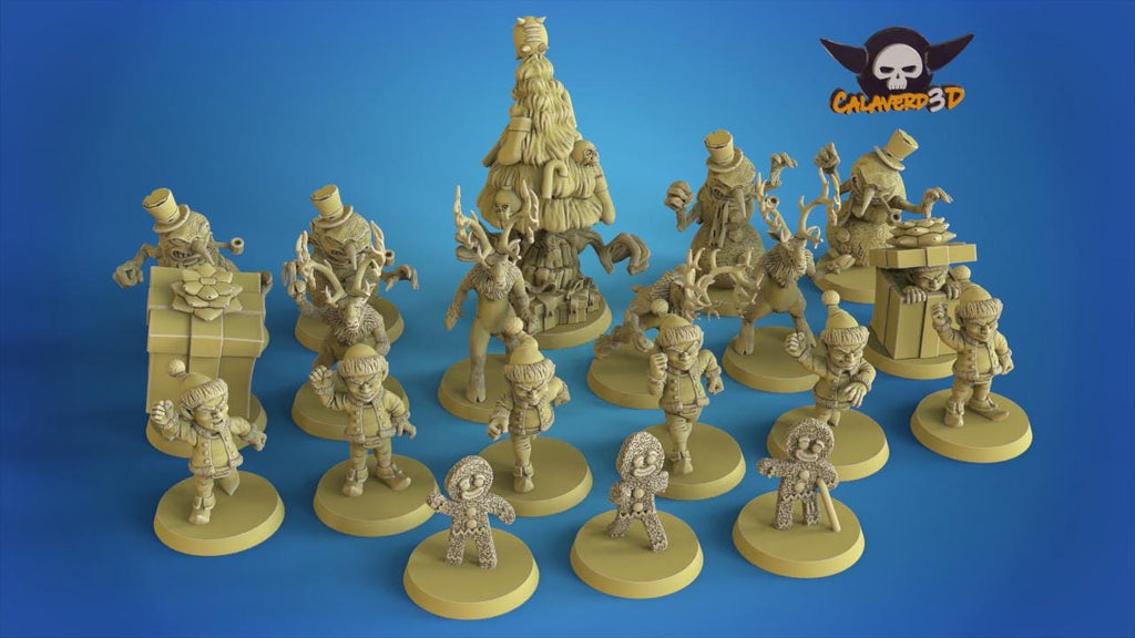 - Scale: 32mm - Resolution: 0.03mm (3 Microns) - Material: Resin - Color: Gray / Flesh (Pink) - Base: Included as pictured in the image - Model Creator: CalaverdThis set includes 20 miniatures that consist's of: - 1 x Tree - 4 x Snowmen - 4 x Reindeer - 2 x presents - 6 x elfs - 3 x gingerbread menMiniatures are printed in the original 32mm scale, if you need a different scale please request it.All miniatures are printed at 0.03mm resolution (3 Microns) on a 4K LCD screen, this resulting in high-quality miniature prints. All prints are washed and cured to ensure as best a finish as possible. We try our very best to ensure supports are removed, but it is always possible that some light cleaning may be required.All miniatures will be posted in pieces to limit damage during postage.Fates Forge is officially licensed to sell physical prints of Calaverd.Please be aware the miniatures are printed in resin and so these models are not suitable for children. It is recommended to seal the Minifigures with a coat of primer before using them in your games.