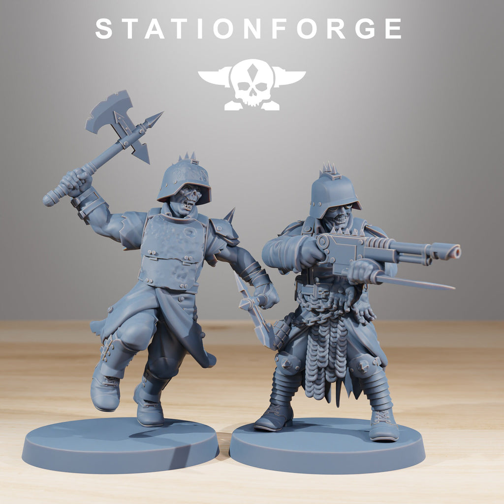 - Set: Station Forge - Resolution: 0.03mm (3 Microns) - Scale: Scaled to fit an 25mm base - Material: Resin - Color: Gray / Fleshy - Base: none13-part set consisting of 12 Corrupted Guards (scaled for 25mm base) alongside 1 Mutant (scaled for 40mm base).*NO BASE INCLUDED*All miniatures are printed at 0.03mm resolution (3 Microns) on a 4K LCD screen, this resulting in high-quality miniature prints. All prints are washed and cured to ensure as best a finish as possible. We try our very best to ensure supports are removed, but it is always possible that some light cleaning may be required.All miniatures will be posted in pieces to limit damage during postage.Fates Forge is officially licensed to sell physical prints of The Dragon TrappersPlease be aware the miniatures are printed in resin and so these models are not suitable for children. It is recommended to seal the Minifigures with a coat of primer before using them in your games.