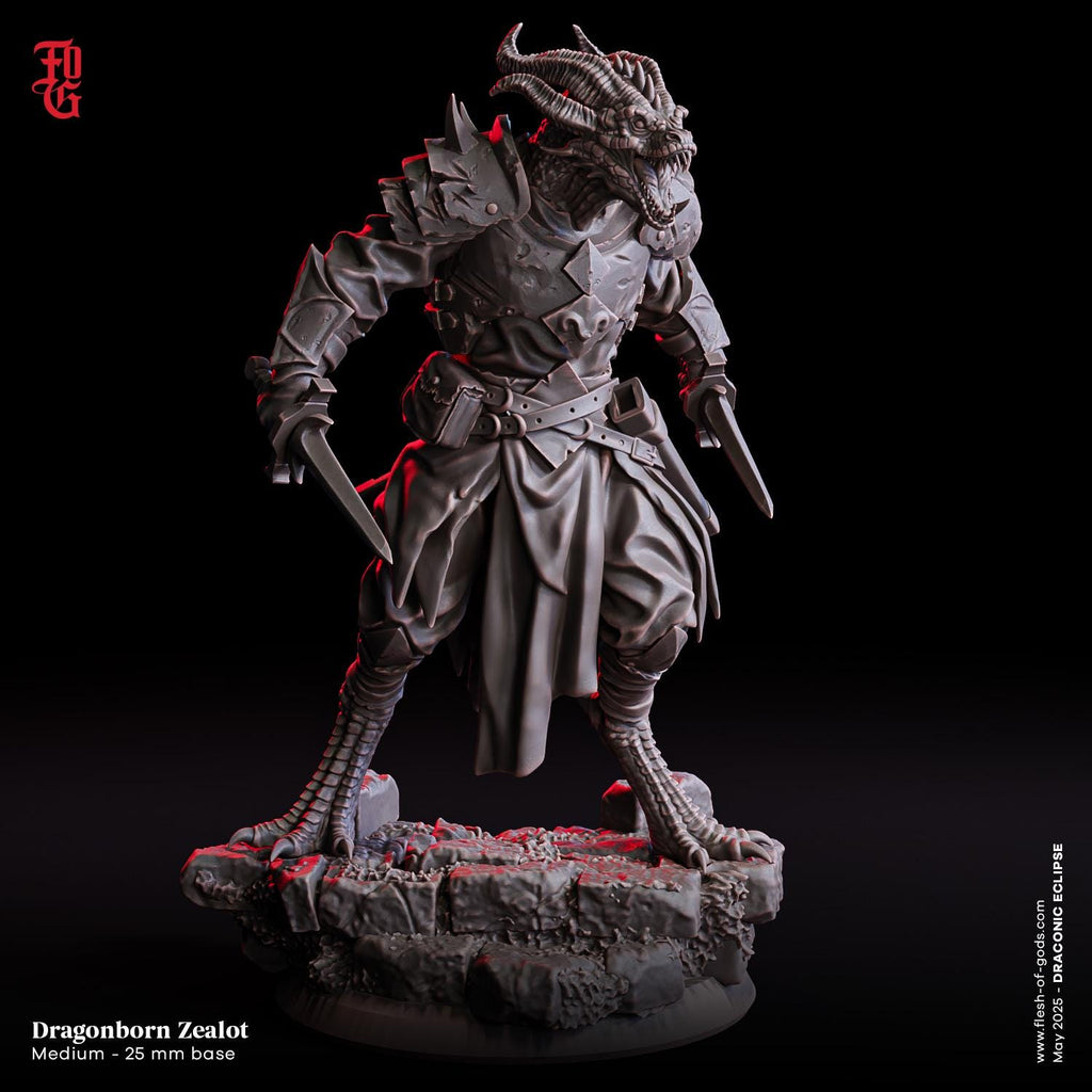 - Name: Dragonborn Zealot- Scale: 25mm Base- Resolution: 0.03mm (3 Microns)- Material: Resin - Color: Gray- Base: Included as pictured in the image- Model Creator: Path of Gods Miniatures are printed in the original 32mm scale, if you need a different scale please request it. All miniatures are printed at 0.03mm resolution (3 Microns) on a 4K LCD screen, this resulting in high-quality miniature prints. All prints are washed and cured to ensure as best a finish as possible. We try our very best to ensure supports are removed, but it is always possible that some light cleaning may be required.Fates Forge is officially licensed to sell physical prints of Flesh of Gods.Please be aware the miniatures are printed in resin and so these models are not suitable for children. It is recommended to seal the Minifigures with a coat of primer before using them in your games.