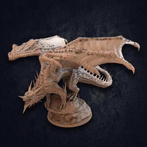 - Set: The Lodge of the wasted - Resolution: 0.03mm (3 Microns) - Scale: 475mm wing to wing. His body width without the wings is 102mm and the base to the highest point on his wing is 145mm. His base is 80mm He is designed to be at 32mm heroic scale. - Material: Resin - Color: Gray or 'fleshy' - Base: Included as pictured in the image - Model Creator: Dragon TrappersAll miniatures are printed at 0.03mm resolution (3 Microns) on a 4K LCD screen, this resulting in high-quality miniature prints. All prints are washed and cured to ensure as best a finish as possible. We try our very best to ensure supports are removed, but it is always possible that some light cleaning may be required.All miniatures will be posted in pieces to limit damage during postage.Fates Forge is officially licensed to sell physical prints of The Dragon TrappersPlease be aware the miniatures are printed in resin and so these models are not suitable for children. It is recommended to seal the Minifigures with a coat of primer before using them in your games.