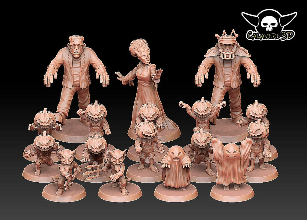 - Scale: 32mm - Resolution: 0.03mm (3 Microns) - Material: Resin - Color: Gray / Flesh (Pink) - Base: Included as pictured in the image - Model Creator: CalaverdThis set includes 19 miniatures that consist's of: - 10 x Pumpkins - 2 x Devils - 2 x Ghosts - 1 x Frankenstein (with pads/helmet) - 1 x Frankenstein (without pads/helmet) - 1 x Countess ElizabethMiniatures are printed in the original 32mm scale, if you need a different scale please request it.All miniatures are printed at 0.03mm resolution (3 Microns) on a 4K LCD screen, this resulting in high-quality miniature prints. All prints are washed and cured to ensure as best a finish as possible. We try our very best to ensure supports are removed, but it is always possible that some light cleaning may be required.All miniatures will be posted in pieces to limit damage during postage.Fates Forge is officially licensed to sell physical prints of Calaverd.Please be aware the miniatures are printed in resin and so these models are not suitable for children. It is recommended to seal the Minifigures with a coat of primer before using them in your games.