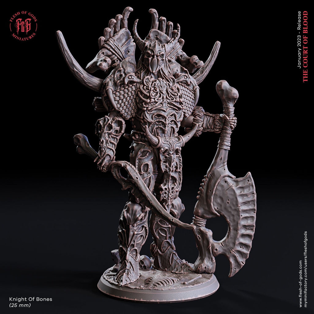 - Name: Knight of bones- Scale: 25mm- Resolution: 0.03mm (3 Microns)- Material: Resin - Color: Gray / Fleshy- Base: Included as pictured in the image- Model Creator: Path of Gods Miniatures are printed in the original 32mm scale, if you need a different scale please request it. All miniatures are printed at 0.03mm resolution (3 Microns) on a 4K LCD screen, this resulting in high-quality miniature prints. All prints are washed and cured to ensure as best a finish as possible. We try our very best to ensure supports are removed, but it is always possible that some light cleaning may be required.Fates Forge is officially licensed to sell physical prints of DM Stash.Please be aware the miniatures are printed in resin and so these models are not suitable for children. It is recommended to seal the Minifigures with a coat of primer before using them in your games.