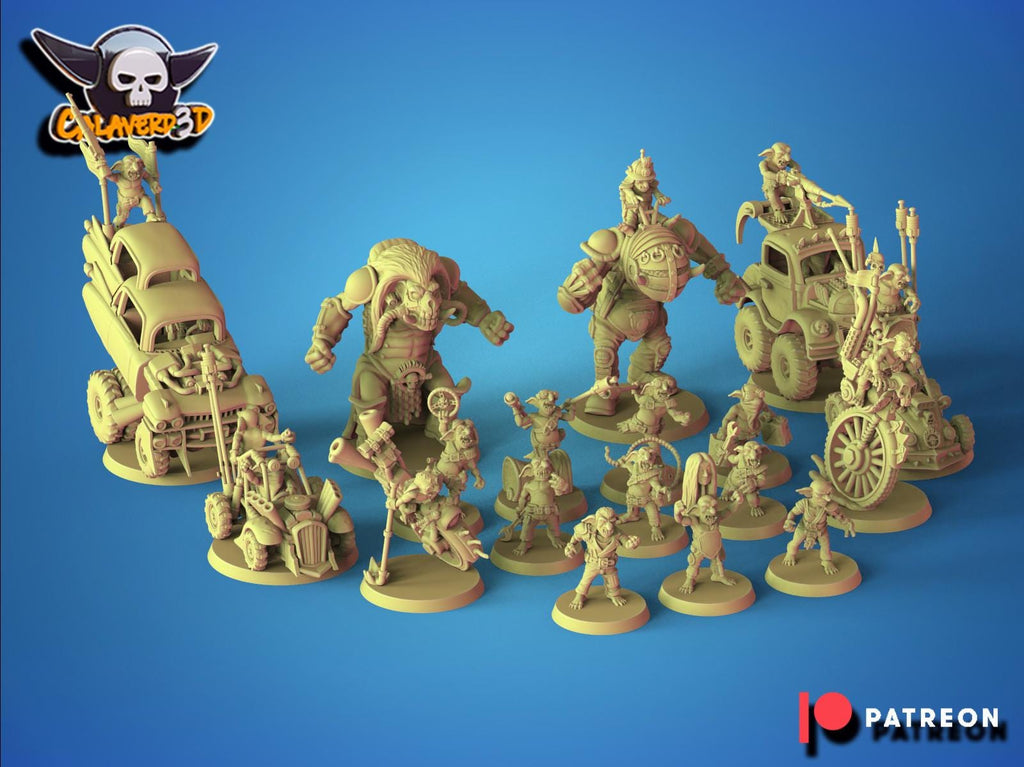 - Scale: 32mm - Resolution: 0.03mm (3 Microns) - Material: Resin - Color: Gray / Flesh (Pink) - Base: Included as pictured in the image - Model Creator: CalaverdThis set includes 18 miniatures that consist's of: - 1 x Pickcup truck with harpoon gunner - 1 x "The Minihorse" with sniper - 2 x buggies with spearmen - 2 x Motorized Unicycles - 1 x Master and Blasttroll - 1 x Immortal troll - 1 x Tiny Fury - 1 x Tinbar - 1 x Mini Max - 5 x War boys - 2 x Warboy kamicaze spearmenMiniatures are printed in the original 32mm scale, if you need a different scale please request it.All miniatures are printed at 0.03mm resolution (3 Microns) on a 4K LCD screen, this resulting in high-quality miniature prints. All prints are washed and cured to ensure as best a finish as possible. We try our very best to ensure supports are removed, but it is always possible that some light cleaning may be required.All miniatures will be posted in pieces to limit damage during postage.Fates Forge is officially licensed to sell physical prints of Calaverd.Please be aware the miniatures are printed in resin and so these models are not suitable for children. It is recommended to seal the Minifigures with a coat of primer before using them in your games.