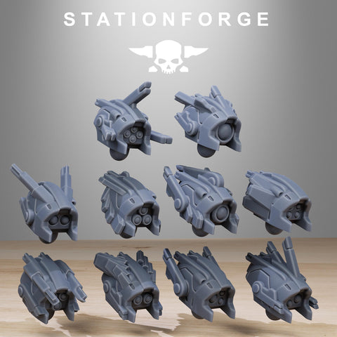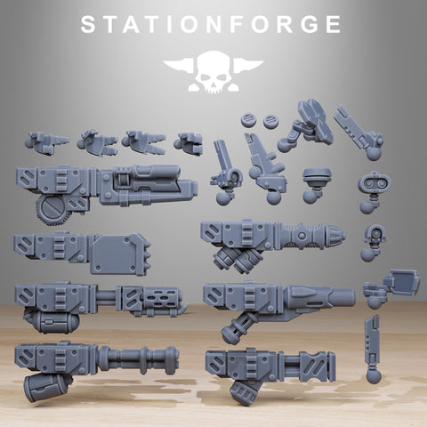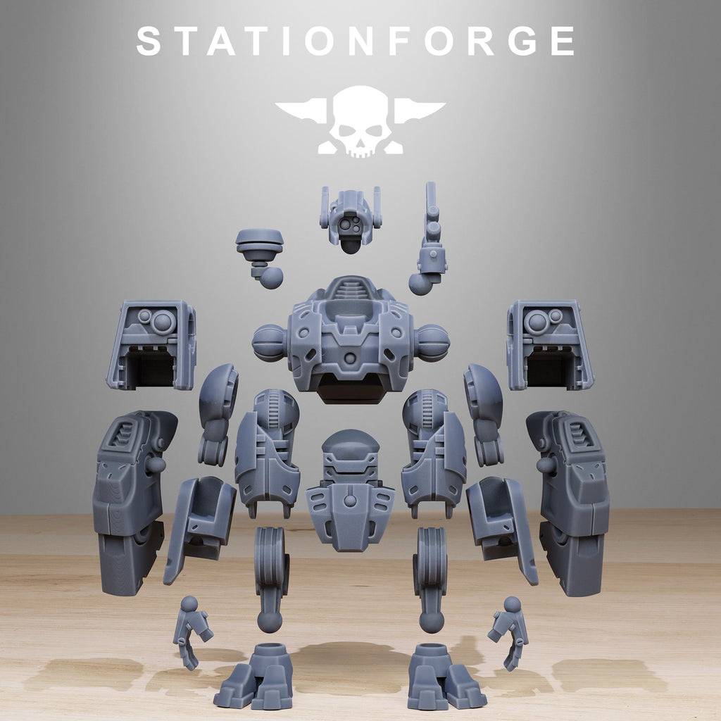 - Set: Station Forge - Consists of One set which allows you to build one of the mechs as picture, parts include: 10 heads 4 hands 7 weapons 10 subsystems 2 arm optionsMulti option attachment points for the weapons, can be fitted on two sides per forearm + back, including optional subsystems on both left and right side of the backThe weapons have 3 points on left, right, top so you are able to rotate and glue the weapons however you like. - Resolution: 0.03mm (3 Microns) - Scale: Scaled to fit an 50mm base - Material: Resin - Color: Gray / Fleshy - Base: No Base*NO BASE INCLUDED*All miniatures are printed at 0.03mm resolution (3 Microns) on a 4K LCD screen, this resulting in high-quality miniature prints. All prints are washed and cured to ensure as best a finish as possible. We try our very best to ensure supports are removed, but it is always possible that some light cleaning may be required.All miniatures will be posted in pieces to limit damage during postage.Fates Forge is officially licensed to sell physical prints of Station ForgePlease be aware the miniatures are printed in resin and so these models are not suitable for children. It is recommended to seal the Minifigures with a coat of primer before using them in your games.